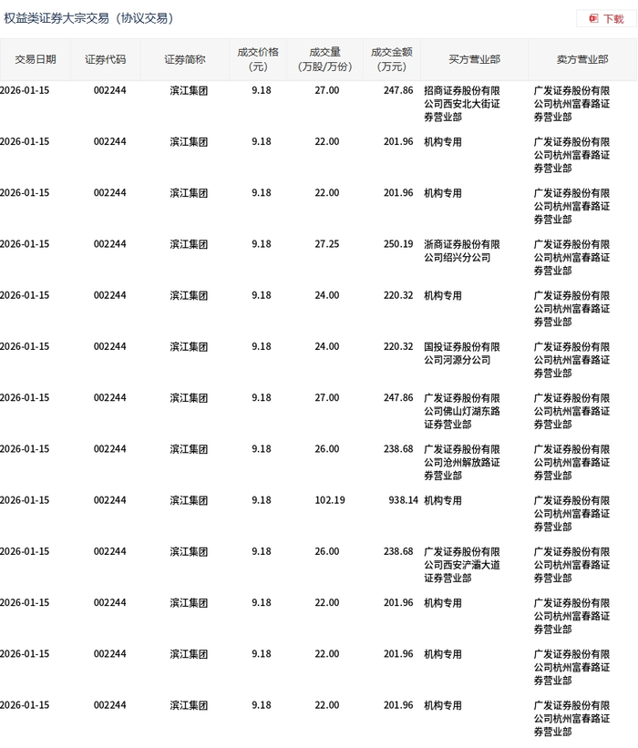 1月15日,滨江集团大宗交易成交393.44万股,成交额3611.85万元,占当日总成交额的5.48%,成交价9.18元,较市场收盘价10.27元折价10.61%。