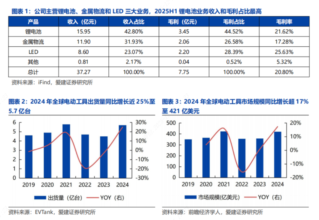 行业与公司情况:1)公司主营锂电池、金属物流和LED三大业务,公司未来的战略核心将聚焦圆柱锂电池产业,打造差异化竞争优势,布局BBU+机器人等新兴场景;LED业务实行高端化差异化战略,持续优化产品结构,盈利能力出色;公司未来增长点主要在于电动工具和智能出行电池市场和BBU+机器人等新场景;2)公司在电动工具电池领域具有强劲的市场竞争力,2024年公司在全球电动工具电池市场份额占比超12%,电动工具无绳化进程仍持续,电芯需求总体呈增长态势;3)积极切入新兴应用场景,较早布局BBU电芯,已实现小批量量产并出货,公司2025Q3确认与台湾能元(Molicel,已进入BBU领域客户供应链并获批量订单)合作,有望进一步打开市场,公司已为宇树、云深处等机器人、大疆无人机供应锂电池电芯;4)公司在LED领域盈利能力出色,坚持高端化差异化战略,持续优化产品结构,2025H1公司LED业务毛利率最高。