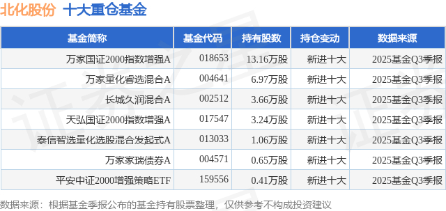 根据2025基金Q3季报公募基金重仓股数据,重仓该股的公募基金共7家,其中持有数量最多的公募基金为万家基金的万家国证2000指数增强A。万家国证2000指数增强A目前规模为3.54亿元,最新净值1.4583(1月5日),较上一交易日上涨2.29%,近一年上涨54.4%。该公募基金现任基金经理为乔亮。乔亮在任的基金产品包括:万家量化睿选混合A,管理时间为2019年8月21日至今,期间收益率为69.01%;万家中证1000指数增强A,管理时间为2019年8月21日至今,期间收益率为132.72%;万家沪深300指数增强A,管理时间为2019年9月6日至今,期间收益率为50.77%;万家中证500指数增强A,管理时间为2019年9月6日至今,期间收益率为112.51%。