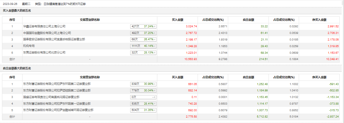 9月26日,华东数控今日涨停,全天换手率达34.44%,振幅达11.74%。龙虎榜数据显示,营业部席位合计净买入7412.17万元。其中,机构买入1349.28万元,卖出29.43万元,合计净买入1319.85万元。此外,华鑫证券上海分公司、中国国际金融上海分公司分别买入3024.74万元、2767.72万元;东方财富证券拉萨东环路第二证券营业部、东方财富证券拉萨团结路第二证券营业部分别卖出1252.48万元、1184.99万元。