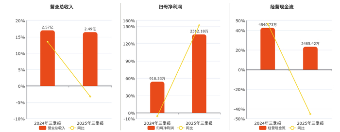 公司营业总收入为2.49亿元,较去年同报告期营业总收入减少825.38万元,同比较去年同期下降3.21%。归母净利润为2312.18万元。经营活动现金净流入为2485.42万元,较去年同报告期经营活动现金净流入减少2055.31万元,同比较去年同期下降45.26%。