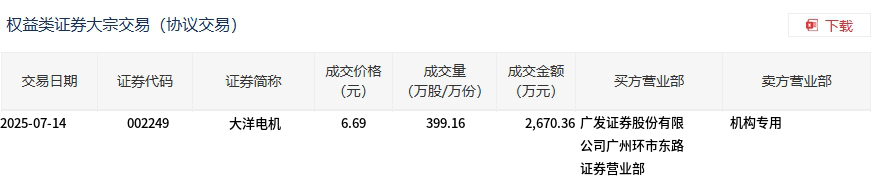大洋电机今日大宗交易折价成交399.16万股,成交额2670.36万元