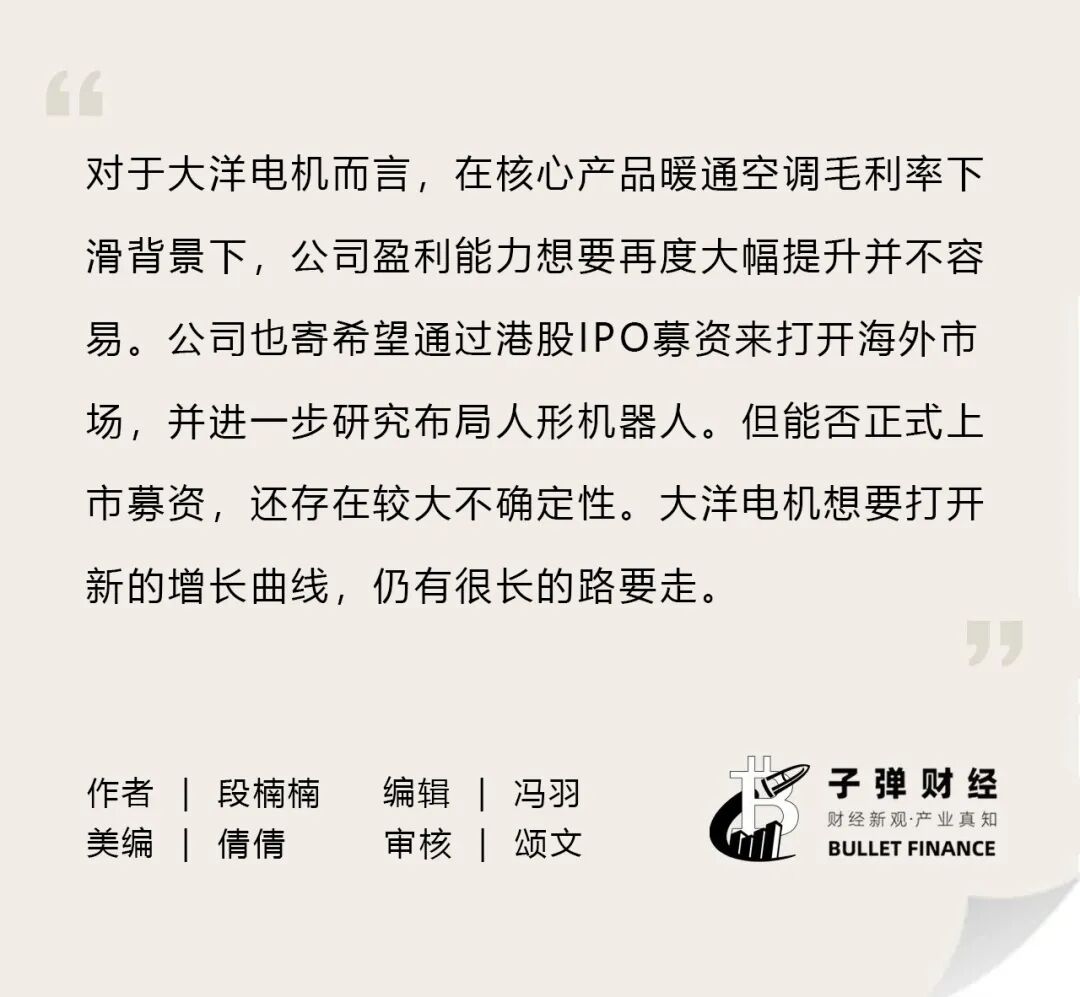 对于大洋电机而言,在核心产品暖通空调毛利率下滑背景下,公司盈利能力想要再度大幅提升并不容易。公司也寄希望通过港股IPO募资来打开海外市场,并进一步研究布局人形机器人。
