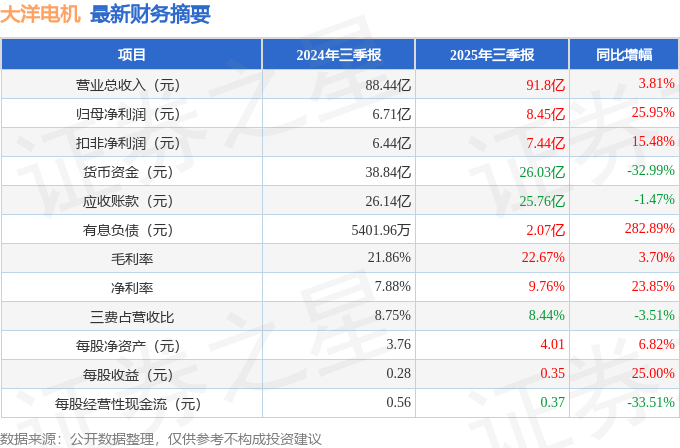 大洋电机(002249)2025年三季报简析:营收净利润同比双双增长,公司应收账款体量较大