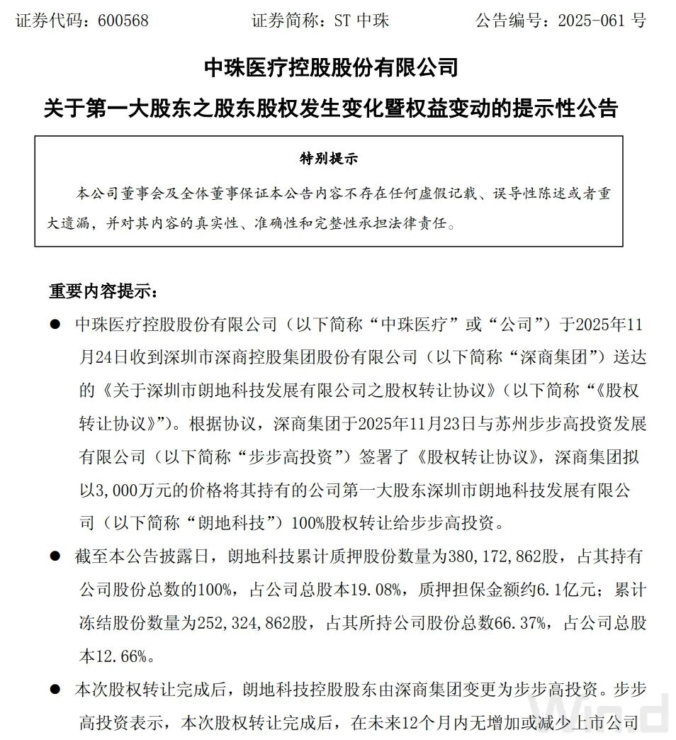 2025年11月24日,ST中珠公告称,第一大股东深圳市朗地科技发展有限公司(持股比例19.08%)的控股股东深商集团,将其持有的朗地科技100%股权以3,000万元转让给苏州步步高(维权)投资发展有限公司。