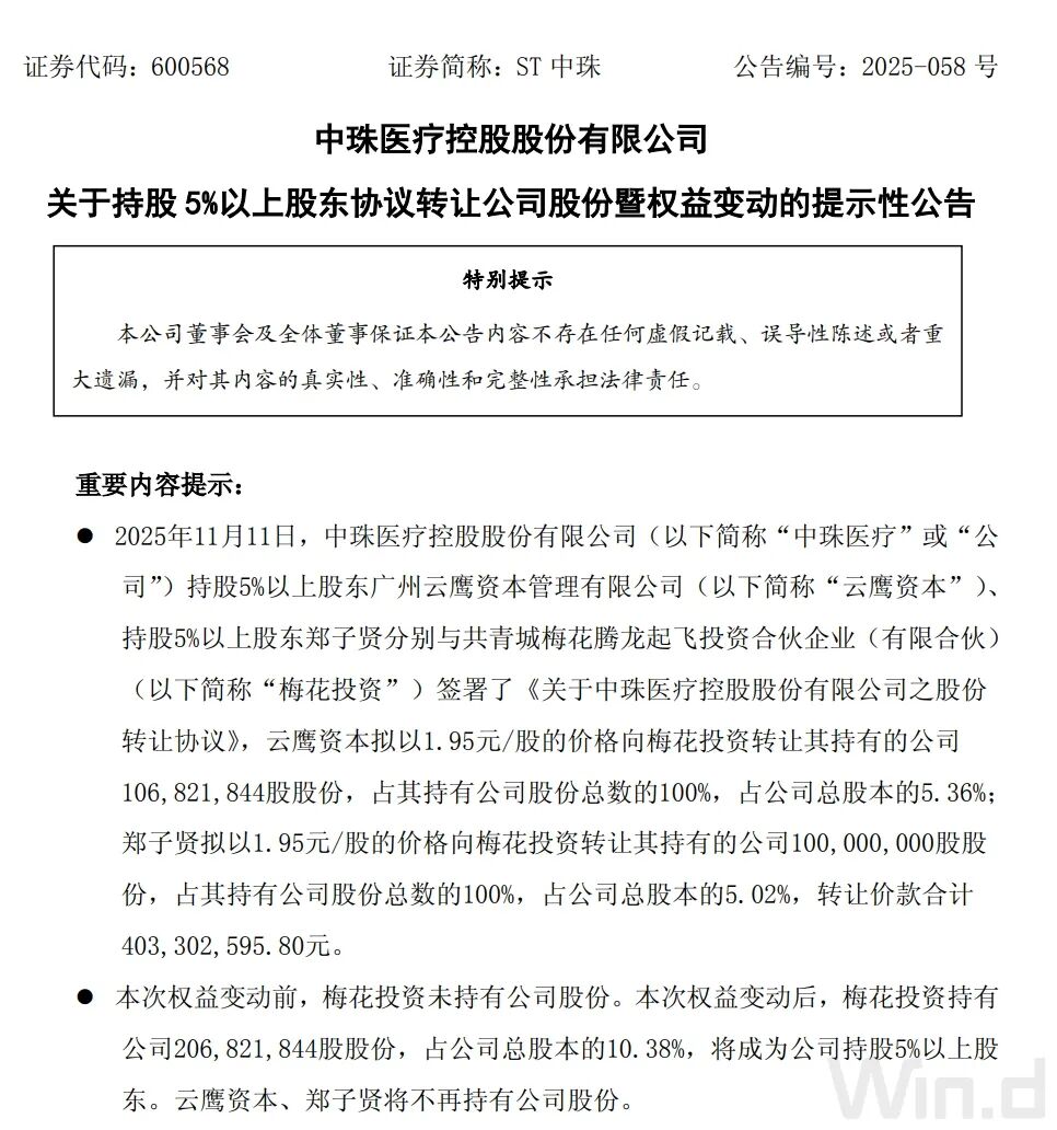 根据公告,2025年11月11日,中珠医疗原持股5%以上股东广州云鹰资本管理有限公司与自然人郑子贤,分别将其持有的公司1.068亿股(占总股本5.36%)和1亿股(占总股本5.02%)以1.95元/股的价格,协议转让给共青城梅花腾龙起飞投资合伙企业(有限合伙)。转让总价合计4.03亿元。