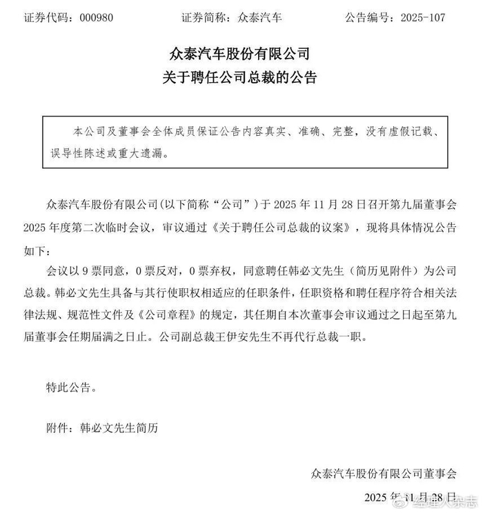11月28日,众泰发布关于聘任公司总裁的公告,宣布聘任韩必文为众泰汽车总裁。资料显示:韩必文拥有丰富的行业经验,此前在奇瑞汽车任职多年,是奇瑞汽车的一名老将。曾担任过奇瑞汽车高级技工、车间主任、副厂长、制造中心总监等职务,2015年9月升任奇瑞捷豹路虎合资公司制造执行副总经理。值得一提的是,除了聘任韩必文为众泰汽车总裁外,众泰汽车在10月30日宣布,聘任李立忠先生为公司非独立董事。据了解,李立忠也曾在奇瑞汽车工作多年,曾担任奇瑞汽车股份有限公司执行副总经理、奇瑞新能源汽车股份有限公司董事长等职务。同一日,官方还宣布正式受聘许明哲先生为公司非独立董事。
