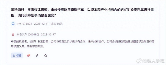 近日,众泰汽车在投资者关系平台上,针对有投资者提出的步步高联手奇瑞汽车,以资本和产业相结合的方式对众泰汽车进行重组的传闻进行答复。众泰方面表示,截至目前,公司与奇瑞及步步高没有合作。未来如有合作,公司会按照相关法律法规要求及时履行信息披露义务。