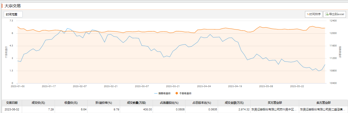 6月2日大宗交易成交408万股,成交额2974.32万元,占当日总成交额的13.81%,成交价7.29元,较市场收盘价6.64元溢价9.79%。