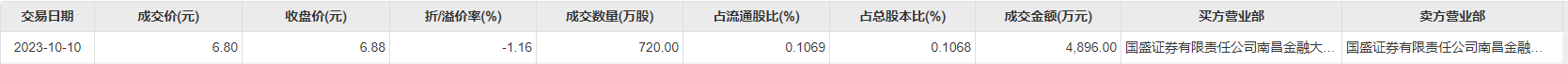 今日大宗交易成交720万股,成交额4896万元,占当日总成交额的21.38%,成交价6.8元,较市场收盘价折价1.16%。