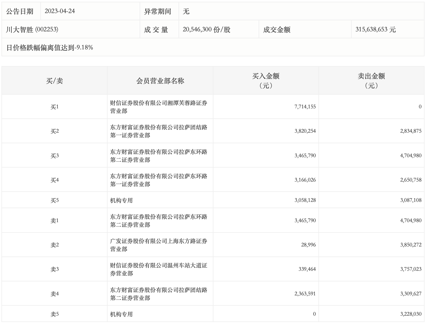 4月24日,川大智胜今日跌停,龙虎榜数据显示,上榜营业部席位全天成交5137.91万元,占当日总成交金额比例为16.28%。其中,买入金额为2395.64万元,卖出金额为2742.27万元,合计净卖出346.63万元。