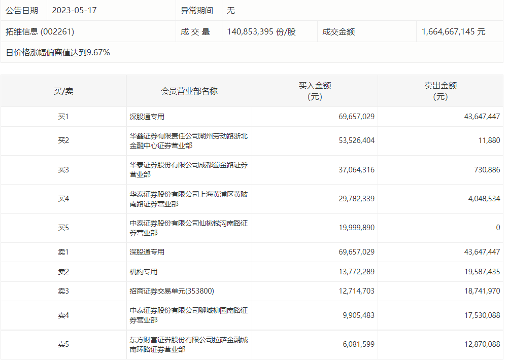 5月17日,拓维信息今日涨停,龙虎榜数据显示,上榜营业部席位全天成交3.7亿元,占当日总成交金额比例为22.21%。其中,买入金额为2.53亿元,卖出金额为1.17亿元,合计净买入1.35亿元。