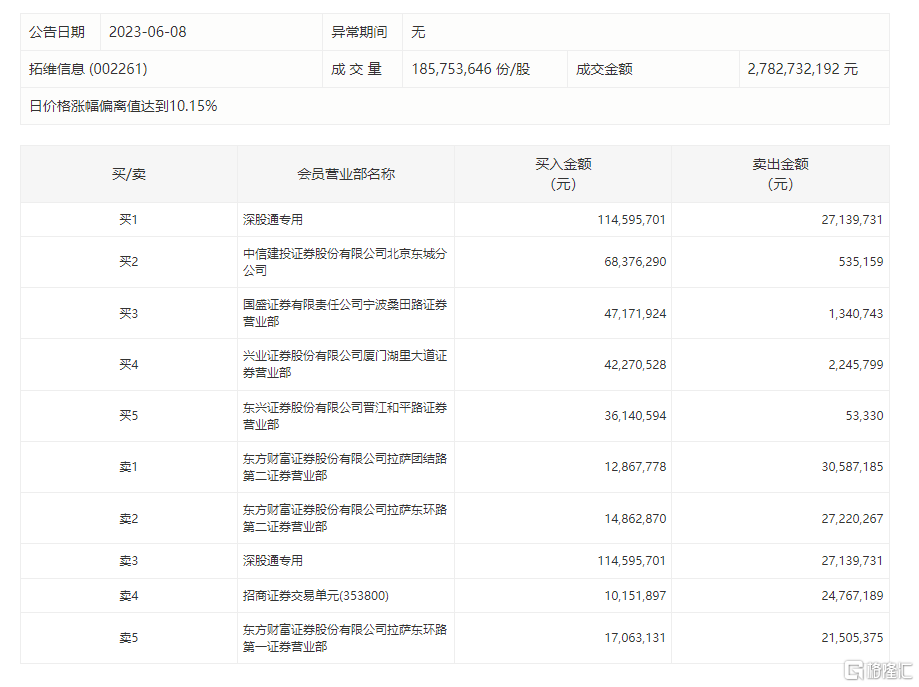 格隆汇6月8日丨拓维信息今日涨停,深股通买入1.15亿元并卖出2714万元,中信建投北京东城分公司净买入6784万元,国盛证券宁波桑田路净买入4583万元。