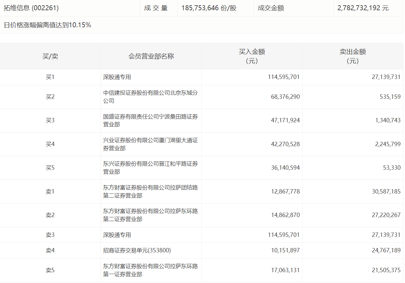 拓维信息今日涨停 深股通买入1.15亿元并卖出2714万元