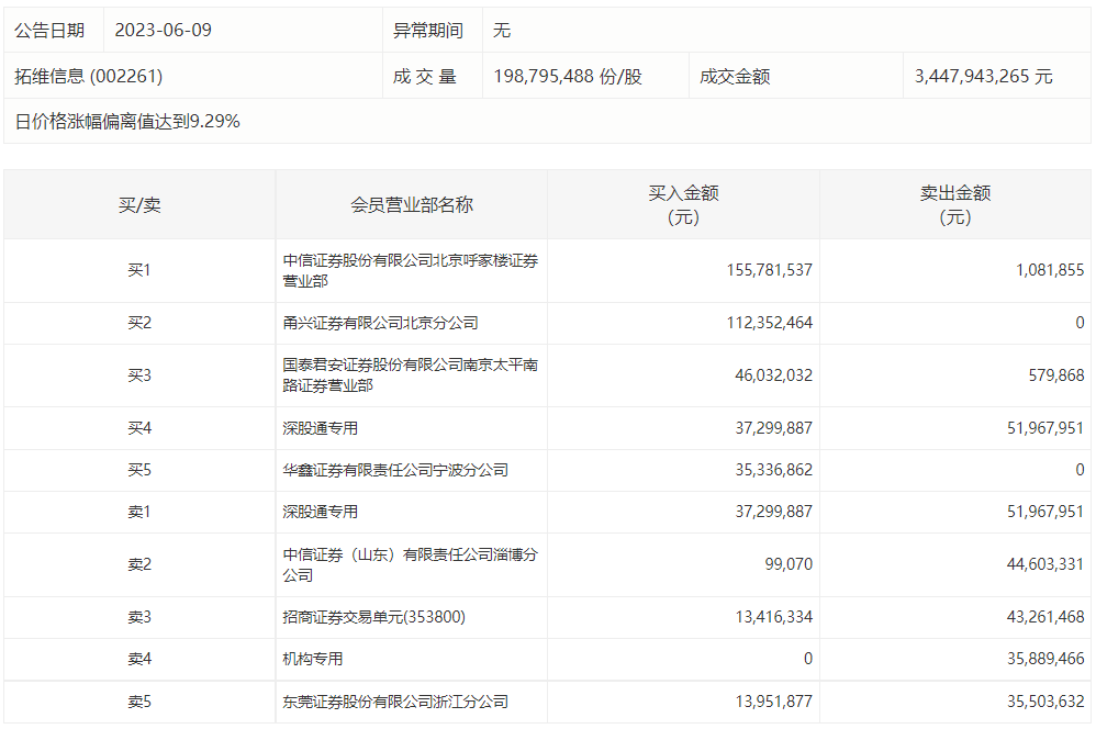 6月9日,拓维信息今日涨停,龙虎榜数据显示,上榜营业部席位全天成交6.27亿元,占当日总成交金额比例为18.19%。其中,买入金额为4.14亿元,卖出金额为2.13亿元,合计净买入2.01亿元。