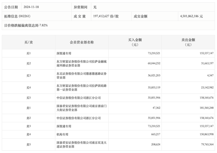 11月18日,拓维信息今日跌停,龙虎榜数据显示,上榜营业部席位全天成交10.23亿元,占当日总成交金额比例为22.72%。其中,买入金额为2.42亿元,卖出金额为7.81亿元,合计净卖出5.39亿元。