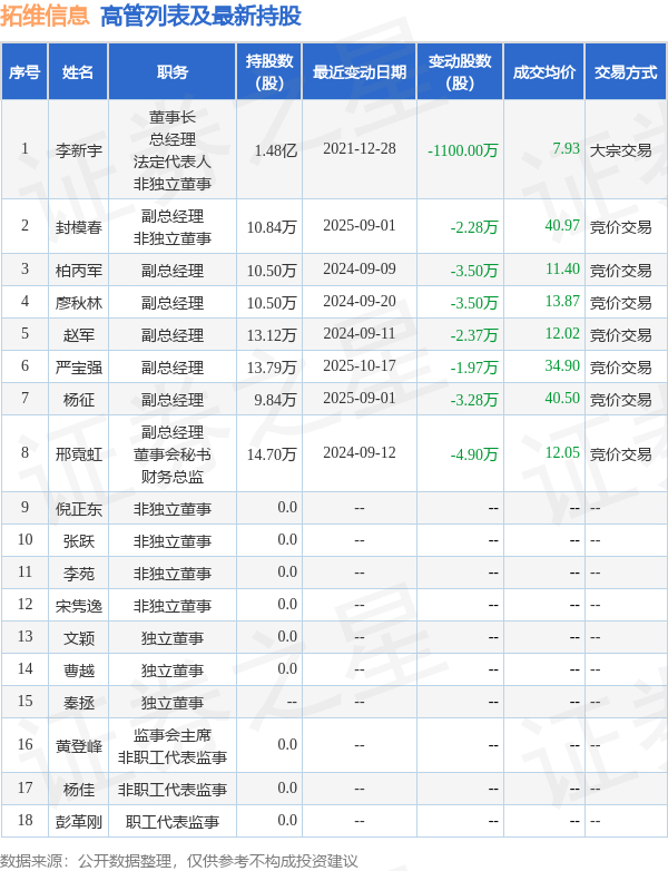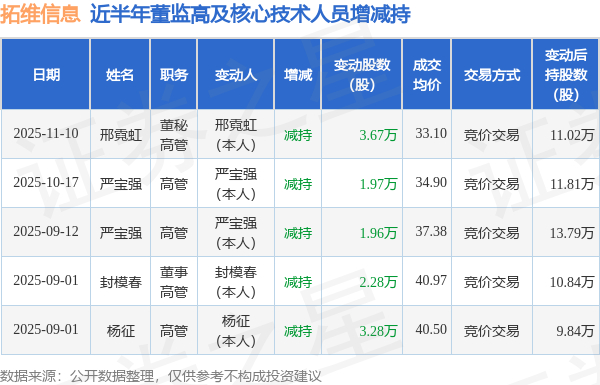 拓维信息近半年内的董监高及核心技术人员增减持详情如下: