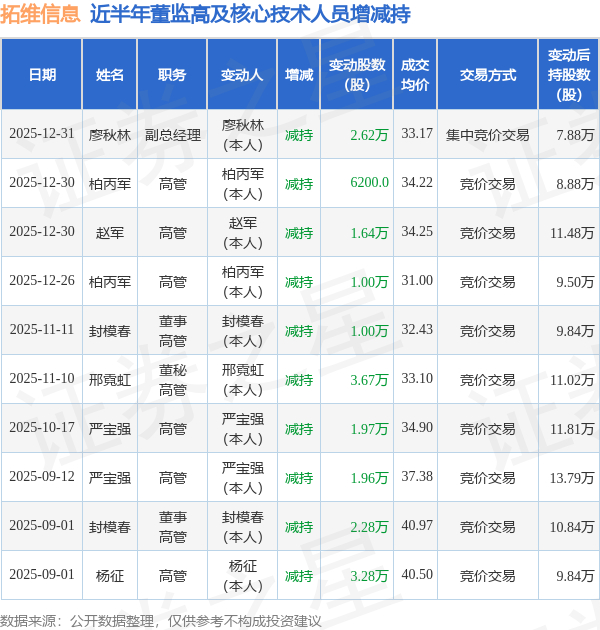 拓维信息近半年内的董监高及核心技术人员增减持详情如下: