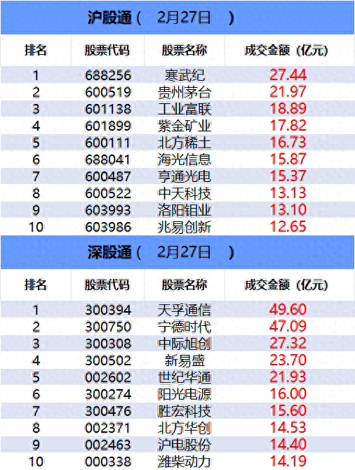 从沪股通前十大成交个股来看,寒武纪位居首位;贵州茅台和工业富联分居二、三位。