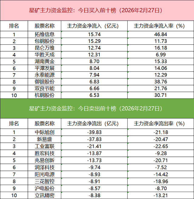 主力资金流出前十的个股所属板块较为分散,中际旭创净流出居首。
