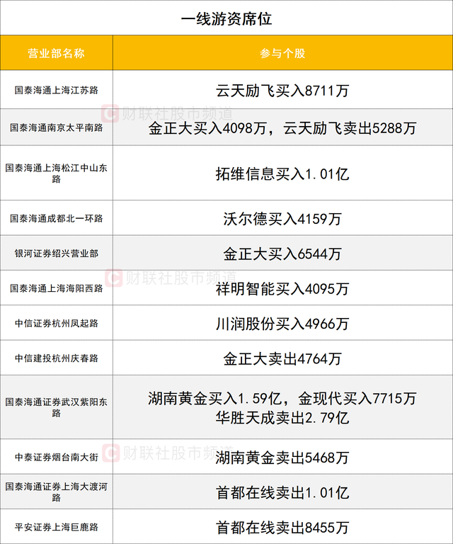 一线游资活跃度较高,算力租赁概念股拓维信息强势涨停,获一家游资(国泰海通证券上海中山东路)买入1.01亿。另一只算力租赁概念股首都在线遭两家一线游资(国泰海通证券上海大渡河路、平安证券上海巨鹿路)合计卖出1.85亿。