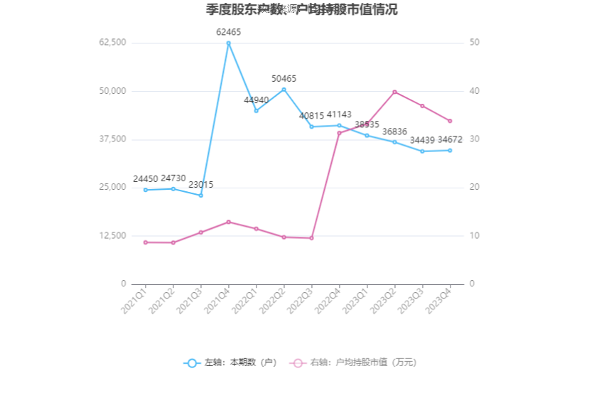 筹码集中度方面,截至2023年年末,公司股东总户数为3.47万户,较三季度末增长了233户,增幅0.68%;户均持股市值由三季度末的36.96万元下降至33.85万元,降幅为8.41%。