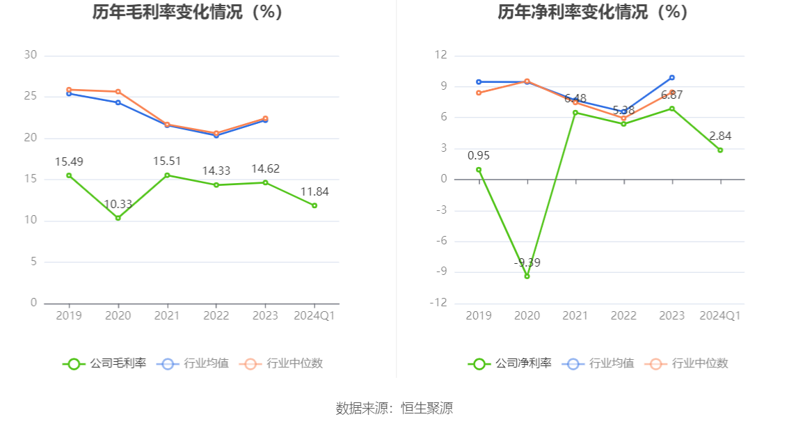 2024年第一季度,公司毛利率为11.84%,同比下降0.63个百分点;净利率为2.84%,较上年同期下降10.92个百分点。