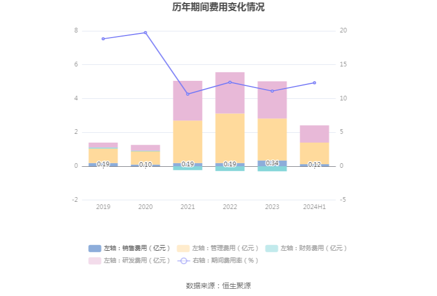 2024年上半年,公司期间费用为2.41亿元,较上年同期增加3274.14万元;期间费用率为12.33%,较上年同期上升2.74个百分点。其中,销售费用同比下降22.93%,管理费用同比增长13.55%,研发费用同比增长22.14%,财务费用由去年同期的-269.70万元变为-13.11万元。