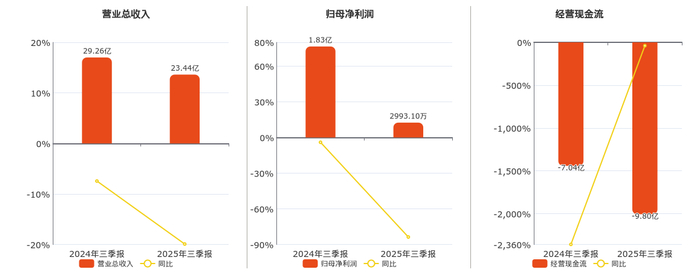 公司营业总收入为23.44亿元,在已披露的同业公司中排名第54,较去年同报告期营业总收入减少5.82亿元,同比较去年同期下降19.90%。归母净利润为2993.10万元,在已披露的同业公司中排名第126,较去年同报告期归母净利润减少1.53亿元,同比较去年同期下降83.66%。经营活动现金净流入为-9.80亿元,在已披露的同业公司中排名第158,较去年同报告期经营活动现金净流入减少2.76亿元。