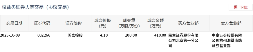 浙富控股今日大宗交易折价成交100万股,成交额410万元