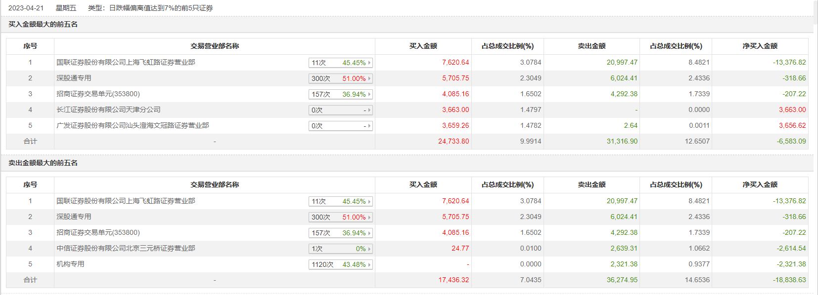 具体来看,机构合计净卖出2321.38万元。此外,国联证券上海飞虹路证券营业部、深股通专用分别卖出2.10亿元、6024.41万元;国联证券上海飞虹路证券营业部、深股通专用分别买入7620.64万元、5705.75万元。