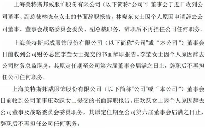 近期美邦服饰多位高管提交辞职报告