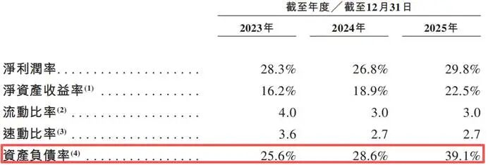 业务规模的扩大,对应的是负债率的提升。过去三年,该公司的资产负债率,分别为25.6%、28.6%、39.1%。在短期流动性方面,其流动比率从2023年的4.0降至2025年的3.0,速动比率从3.6降至2.7。