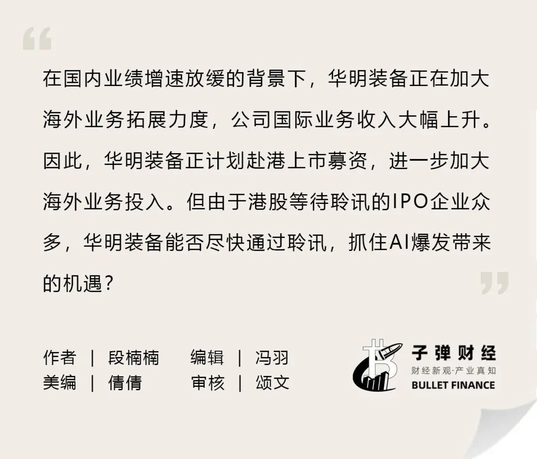 在国内业绩增速放缓的背景下,华明装备正在加大海外业务拓展力度,公司国际业务收入大幅上升。因此,华明装备正计划赴港上市募资,进一步加大海外业务投入。但由于港股等待聆讯的IPO企业众多,华明装备能否尽快通过聆讯,抓住AI爆发带来的机遇,「子弹财经」将持续保持关注。
