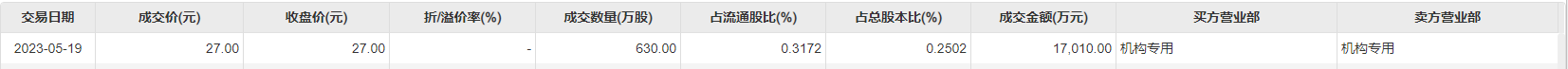 5月19日大宗交易成交630万股,成交额1.7亿元,占当日总成交额的28.12%,成交价27元,较市场收盘价27元持平。