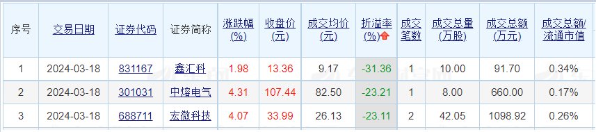 成交价方面,东方园林、 协鑫集成、国科微溢价率居前,溢价率依次为 11.43%、7.66%、7.43%;鑫汇科、中熔电气、宏微科技折价率居前,折价率依次为31.36%、23.21%、23.11%。