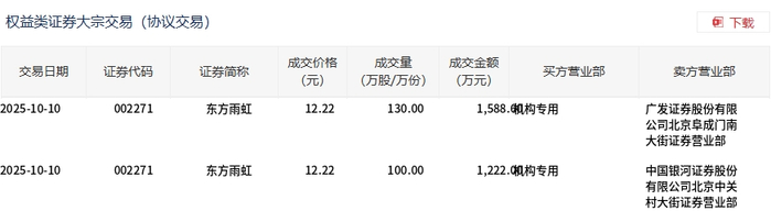 10月10日,东方雨虹大宗交易成交230万股,成交额2810.6万元,占当日总成交额的3.15%,成交价12.22元,较市场收盘价12.86元折价4.98%。