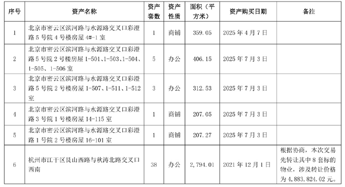 公告明确,本次交易标的包括北京市密云区滨河路与水源路交叉口彩澄路3号院、5号院的多套商铺及办公用房,以及杭州市上城区(原江干区)的部分办公用房及公寓。其中,北京密云区14-115室、1-507室等标的的购入日期为2025年7月3日,距本次出售公告发布仅4个多月。