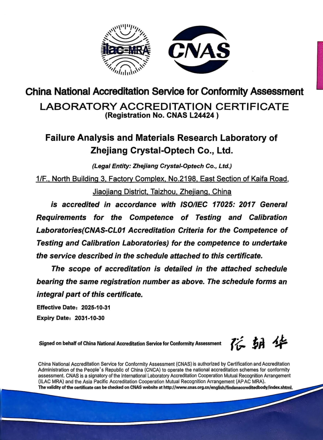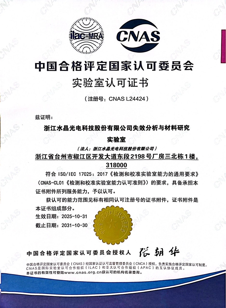 2025年11月,水晶光电失效分析与材料研究实验室凭硬核实力,顺利通过中国合格评定国家认可委员会(CNAS)严苛审核,正式获颁CNAS认可证书。这标志着实验室检测能力与服务质量已接轨国际标准,彰显了企业核心技术创新力与综合竞争力,为深耕国际市场筑牢品质根基”。