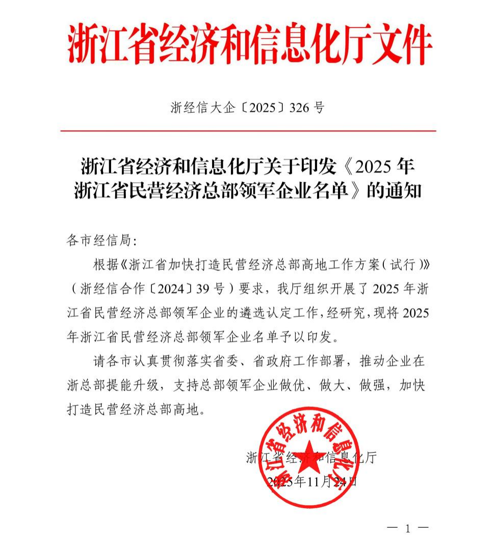 浙江省民营经济总部领军企业是浙江落实“地瓜经济”提能升级“一号开放工程”的核心抓手,也是打造浙江民营经济总部高地的标杆主体。该称号授予具备全球运营与管控能力,且在经营规模、创新实力、发展实绩上处于行业领先地位的民营经济总部企业。