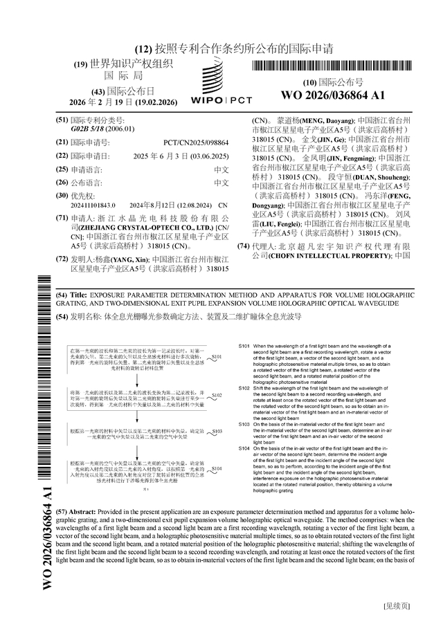 水晶光电公布国际专利申请:“体全息光栅曝光参数确定方法、装置及二维扩瞳体全息光波导”