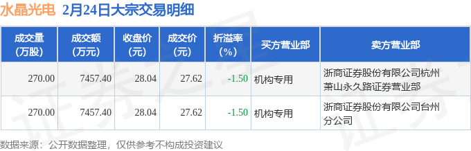2月24日水晶光电现2笔大宗交易 机构净买入1.49亿元