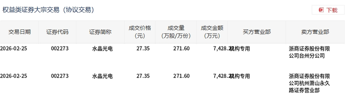 2月25日,水晶光电大宗交易成交543.2万股,成交额1.49亿元,占当日总成交额的11.62%,成交价27.35元,较市场收盘价27.78元折价1.55%。