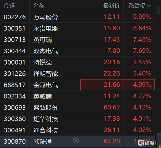 格隆汇5月10日丨万马股份直线拉升封涨停,永贵电器、祥明智能、双杰电气、特锐德、英威腾等跟涨。