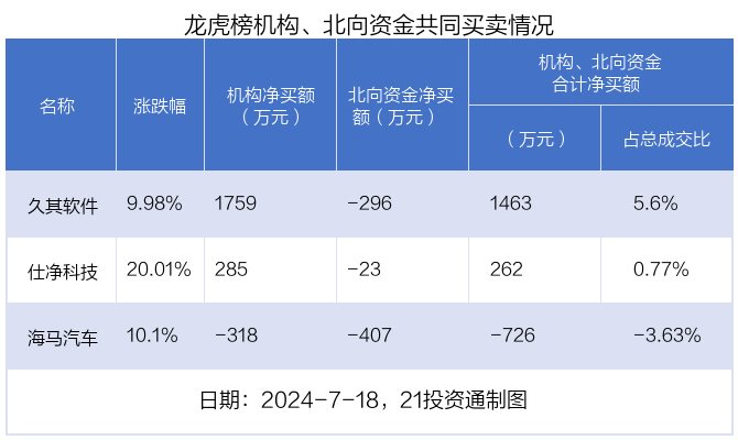 值得注意的是,机构和北向资金共同净卖出了海马汽车;在仕净科技,久其软件上出现分歧,机构净买入仕净科技285.05万元,北向资金净卖出23.08万元;机构净买入久其软件1758.8万元,北向资金净卖出296.01万元。