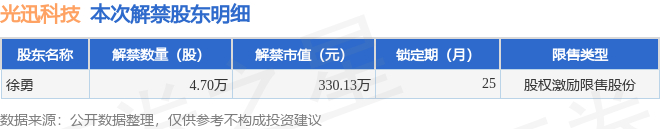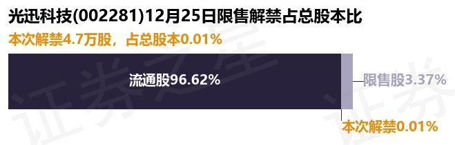 光迅科技(002281)4.7万股限售股将于12月25日解禁,占总股本0.01%