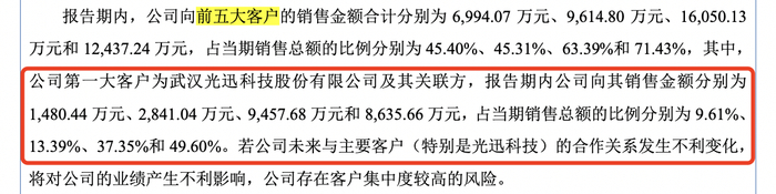 其中, 公司第一大客户为武汉光迅科技股份有限公司及其关联方,报告期内公司向其销售金额分别为1480.44万元、2841.04万元、9457.68万元和8635.66万元,占当期销售总额的比例分别为9.61%、13.39%、37.35%和49.60%。
