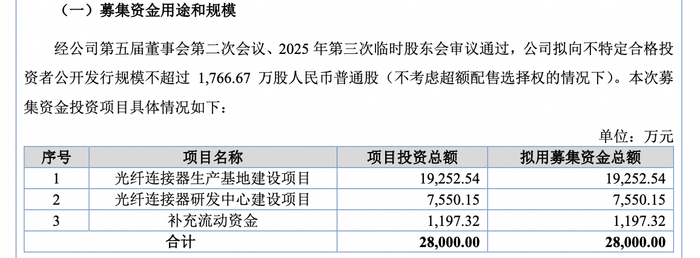 本次IPO,宇特光电拟募资2.8亿元,用于光纤连接器生产基地建设项目、光纤连接器研发中心建设项目、补充流动资金。
