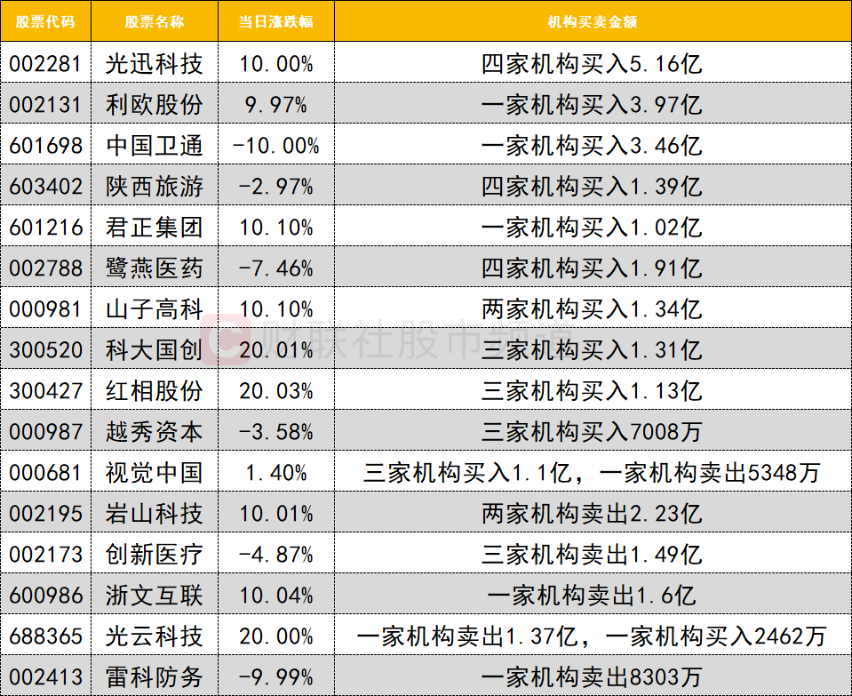 卖出方面,岩山科技遭两家机构卖出2.23亿。商业航天人气股雷科防务遭一家机构卖出8303万。