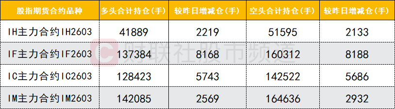 四大期指主力合约中,IH、IF、IC、IM合约多空双方均加仓,IM合约空头加仓数量较多。